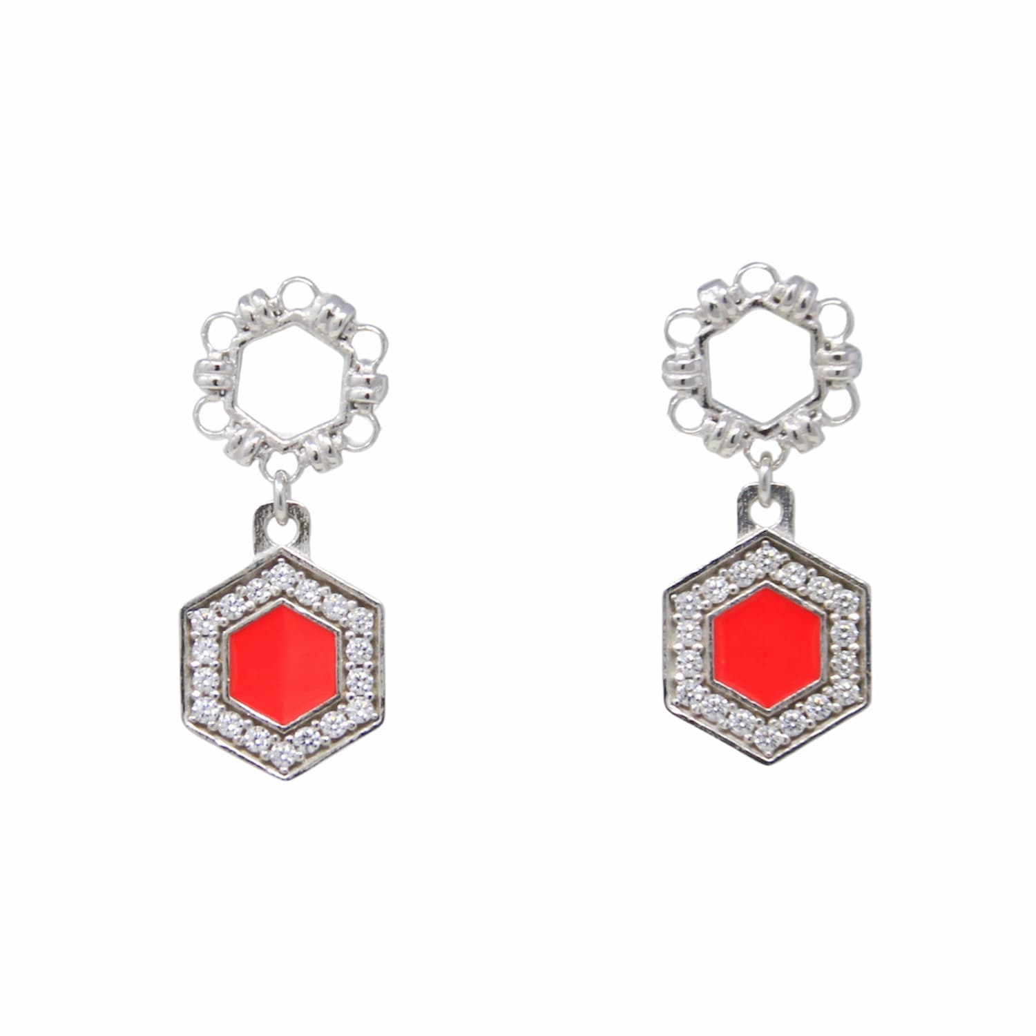Deco Statement Earrings in Silver With Coral & Pavé
